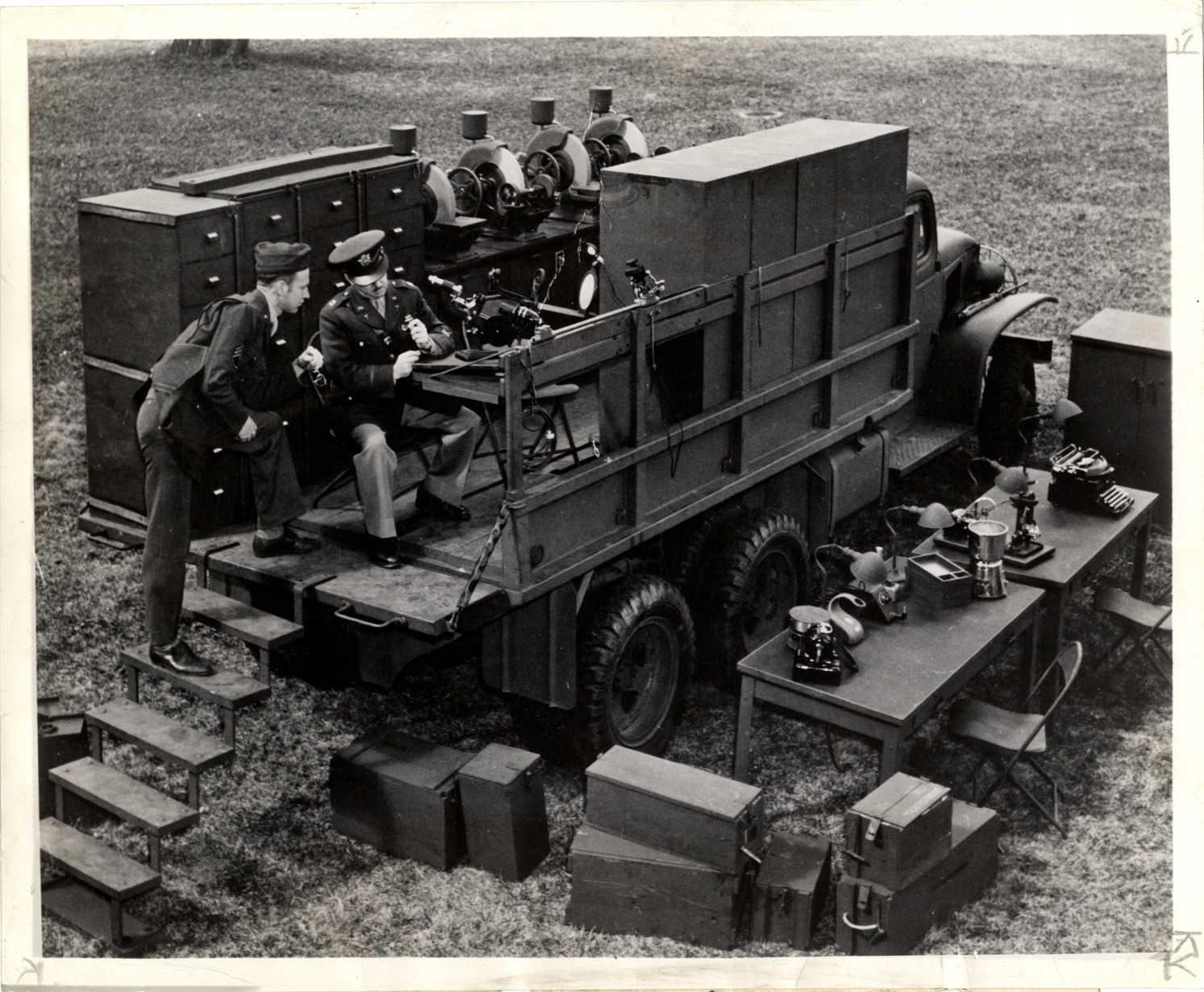 View of two soldiers with a mobile optical shop, installed on the bed of a truck. Grinding machines and filing cabinets on truck bed; table holding lamps and typewriter on right. Storage containers in foreground. Handwritten on back: "Mobile optical shop, eyeglasses repair. See Automotive War Production, August, 1942, p. 7. War workers--Unusual."