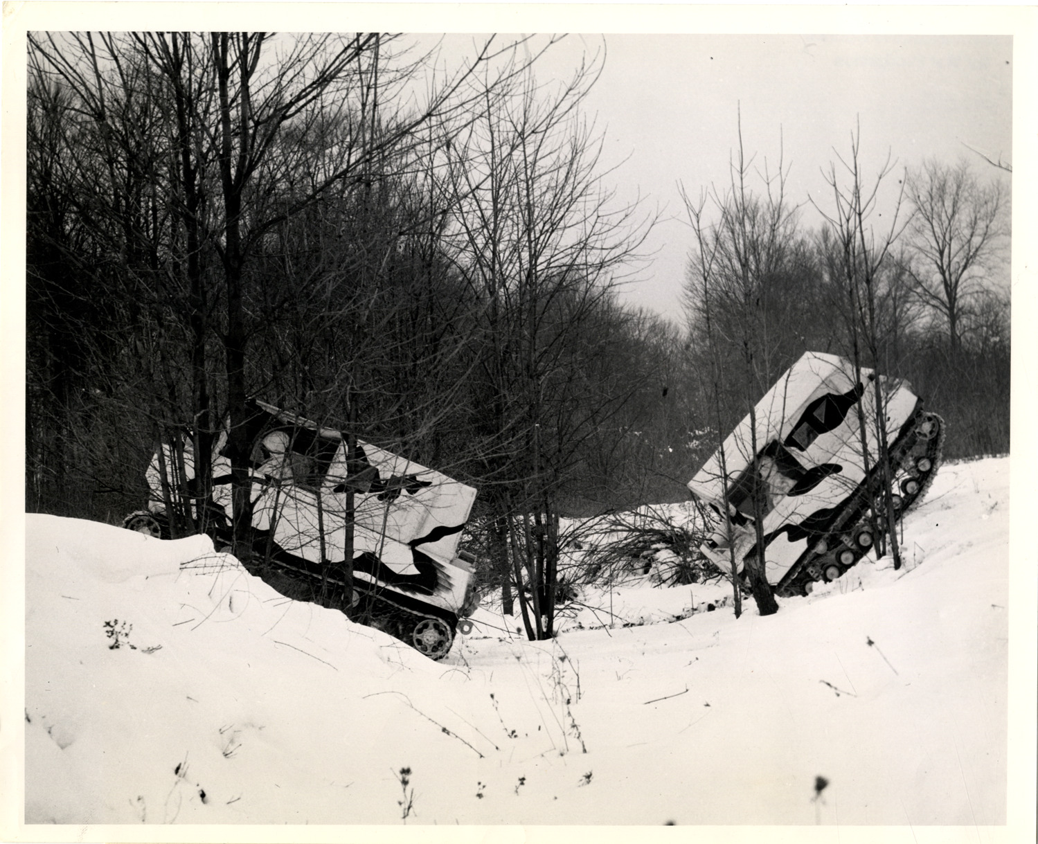 View of two camouflaged Studebaker Weasels, a military vehicle used as a personnel and supply carrier. Label on back: "A radical vehicle of war, which has been in secret production at the Studebaker automobile factory in South Bend, Ind., for almost two years, has just been revealed by the War Department. It is the 'Weasel,' (known to the Army as the M-29), a low-slung, square-faced personnel and supply carrier that is capable of operating over snow, deep mud, sand or on paved highways -- a greater variety of terrain conditions than possible in any other vehicle. Chief reason for the Weasel's ability to negotiate terrain impassable to conventional wheeled or track-laying vehicles is light weight combined with broad tracks. Pressure on the ground exerted by the Weasel is about one-fourth that of a fully equipped infantryman. Tracks are rubber-padded and powered by a Studebaker Champion passenger car engine located in front and at the right of the driver. Weasels are equipped with a demountable top and camouflaged in black and white for missions in snow countries." Handwritten on back: "Weasels."