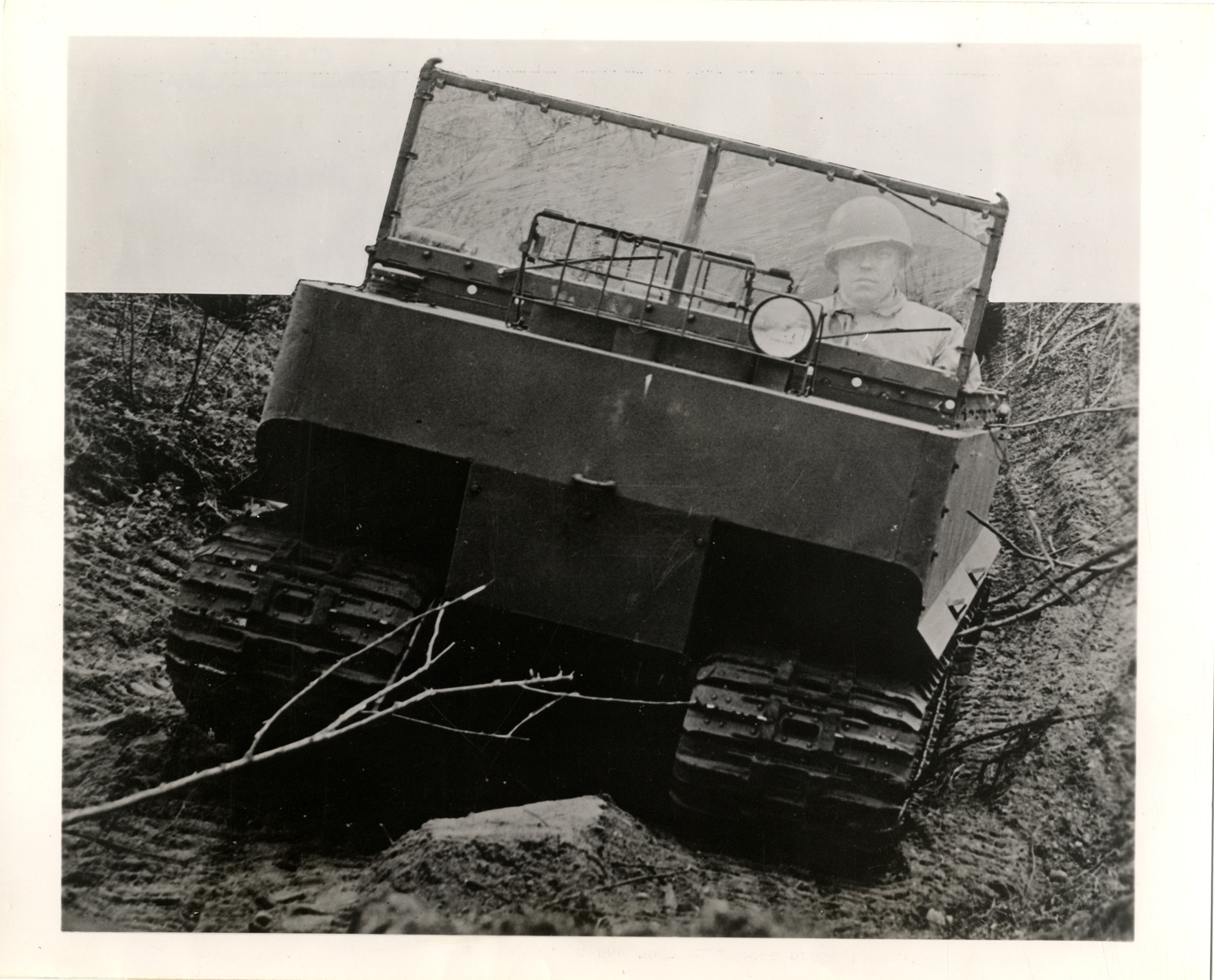 View of a soldier in a Studebaker Weasel, a military vehicle used as a personnel and supply carrier. Label on back: "A radical vehicle of war, which has been in secret production at the Studebaker automobile factory in South Bend, Ind., for almost two years, has just been revealed by the War Department. It is the 'Weasel,' (known to the Army as the M-29), a low-slung, square-faced personnel and supply carrier that is capable of operating over snow, deep mud, sand or on paved highways -- a greater variety of terrain conditions than possible in any other vehicle. Chief reason for the Weasel's ability to negotiate terrain impassable to conventional wheeled or track-laying vehicles is light weight combined with broad tracks. Pressure on the ground exerted by the Weasel is about one-fourth that of a fully equipped infantryman. Tracks are rubber-padded and powered by a Studebaker Champion passenger car engine located in front and at the right of the driver. Weasels are equipped with a demountable top and camouflaged in black and white for missions in snow countries." Handwritten on back: "Weasels."