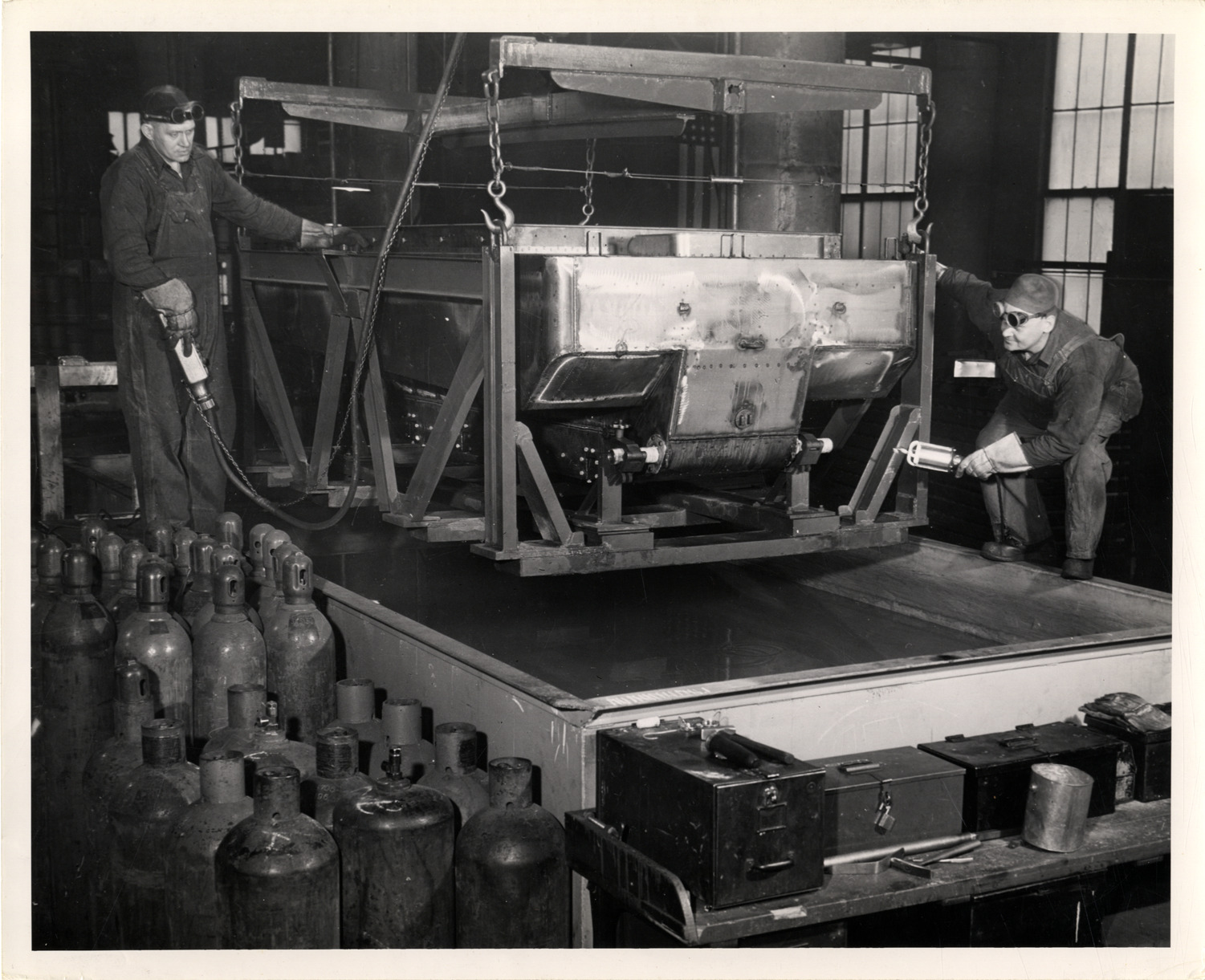 View of workers inspecting a Studebaker Weasel amphibious vehicle for leaks at the Studebaker factory. Label on back: "A water-going version of the famed Weasel, which has won GI respect as a transportation unit over mud, snow and sand, was revealed by Studebaker today. Primary difference between earlier Weasels (M-29) and the new M-29C is a longer, boat-shaped body. The Weasel's advantage over other amphibious craft, says the manufacturer, is an ability to climb steep river banks and its ready conversion to water travel. Rudders to aid maneuverability are merely released over the stern. Propulsion is from a continuous circuit track powered by a Studebaker passenger car engine, exactly as in land operations. Above: Bodies are lowered into a water tank in one of three tests for leakage at the Studebaker plant." Stamped on back: "Studebaker, South Bend, Indiana." Handwritten on back: "Weasels."