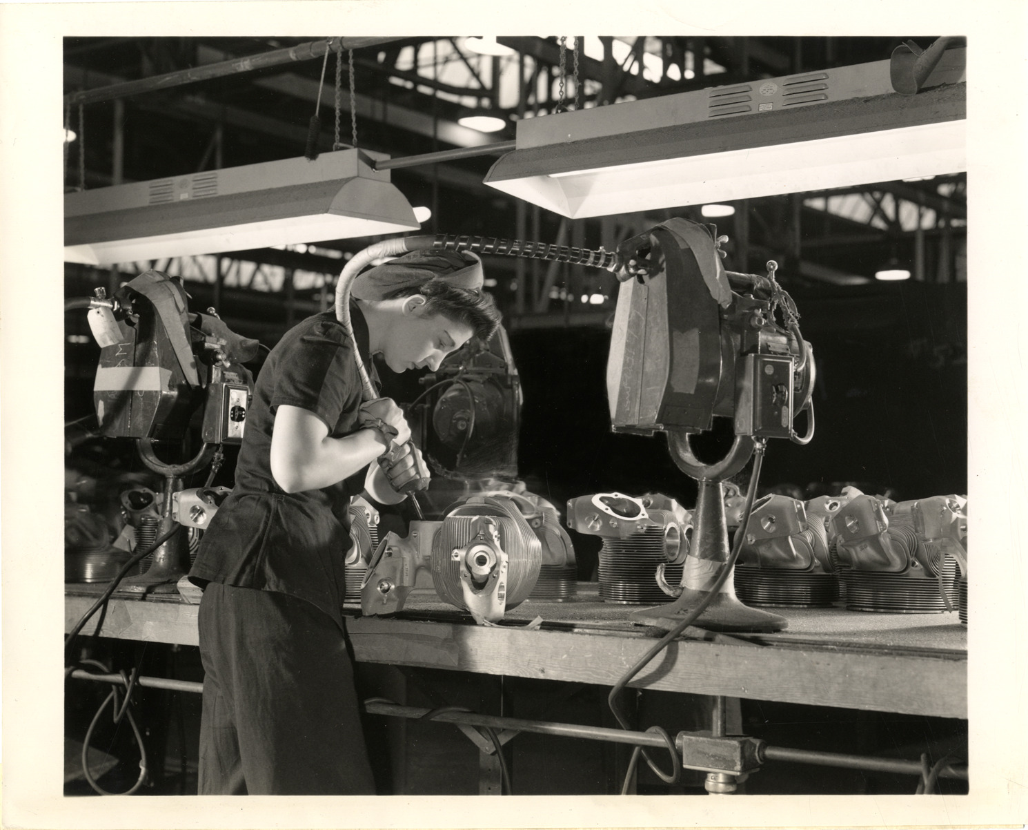View of a woman using a burring tool to remove excess stock from aircraft parts at the Chevrolet plant. Label on back: "Performing many operations formerly assigned to men, women are helping to solve the manpower shortage in the production of aircraft engines. This girl is removing excess stock with a burring tool from parts which flow from her work bench for assembly in Pratt & Whitney aircraft engines produced in ever-mounting volume by Chevrolet for bombers and cargo planes. By dividing operations into simple components, Chevrolet has been able to utilize many female workers in the plants producting aircraft engines." Stamped on back: "General Motors Photographic." Handwritten on back: "Women workers."