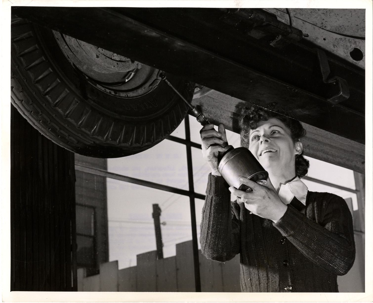 View of Grace Northrup servicing an automobile on hoist. Printed on back: "Women in essential services. D-9776. Formerly a salesgirl, librarian, and sixth-grade school teacher, Grace Northrup of San Francisco has been repairing and servicing cars for the past six months. She's becoming an expert in this field once open only to men. (Feb. 1943.) Please credit: Official OWI photo by Ann Rosener. Watch your credit. No objection to reproducing or publishing this picture provided credit line 'Photo by Office of War Information' appears on the photograph or page. Except that publishers must assume responsibility for all use in commercial advertising and OWI must not appear as the sponsor of any product." Handwritten on back: "Women workers."