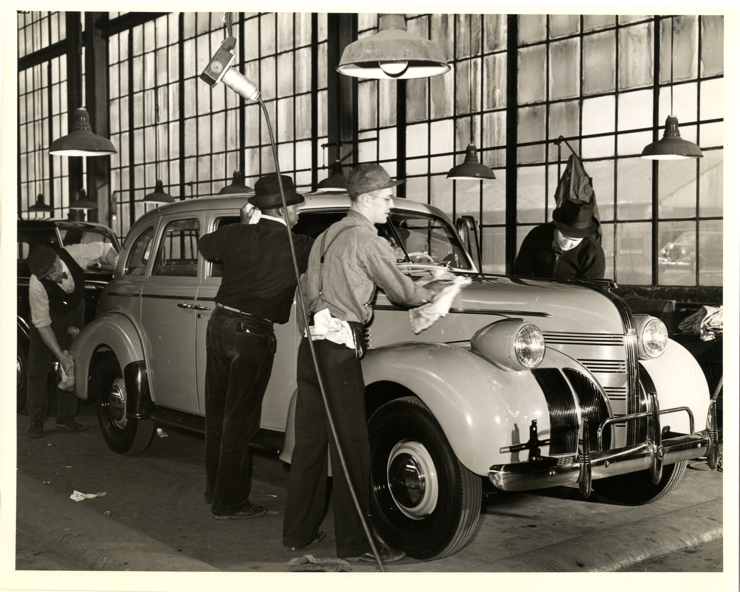 View of several men polishing a Pontiac automobile in the factory in preparation for owner driveaway. Label on back: "Servicing a Pontiac for owner driveaway. The last step in getting a car ready for delivery to the owner at the Pontiac factory is a thorough polish. A special service line for drive-away owners is maintained where Pontiac cars are lubricated, tuned up and put in the finest condition for a long drive-away." Handwritten on back: "Factories--Pontiac, 1939."