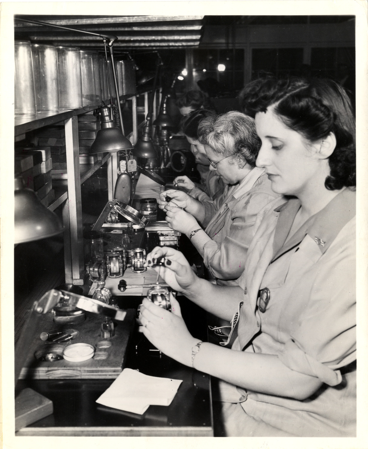 Women workers on assembly line for aircraft flight instruments, Ternstedt Manufacturing Division plant