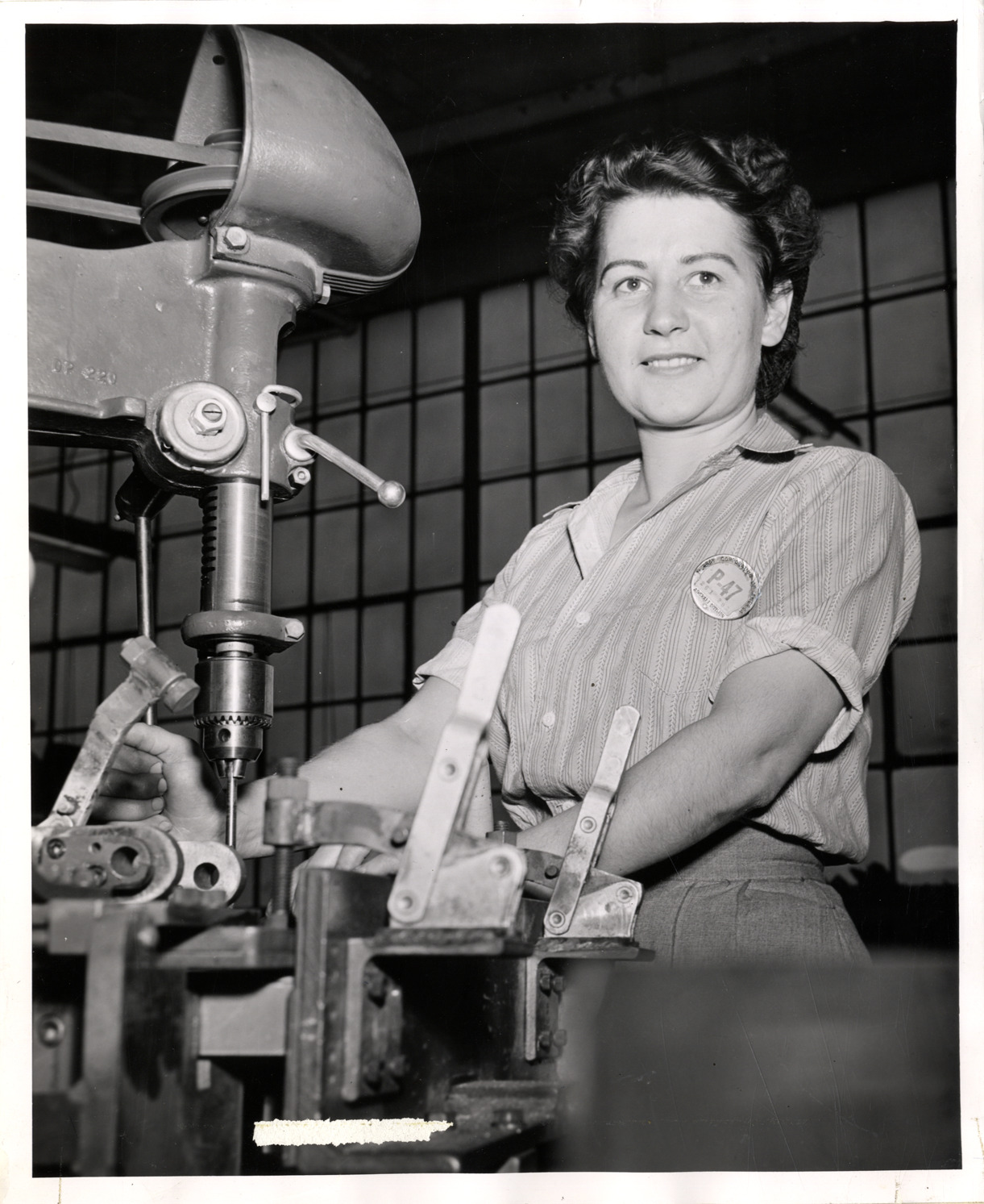 View of a woman worker operating machinery in the assembly of P-47 Thunderbolt fighter planes at the Murray Corporation of America factory. Label on back: "Her friends call her 'the typical war worker' because she manages two battlefronts: home and warplant. But she finds there are difficulties to turning out P47 Thunderbolts and breaded veal chops the same day. She needs help with her wartime problems, not because she isn't self-reliant, but because some of the problems require community effort as well as individual initiative." Stamped on back: "Photographic Department, authorized print no. 1439-19, date 11-1-43, Murray Corporation, Detroit." Handwritten on back: "[Same text as label]. Women workers."