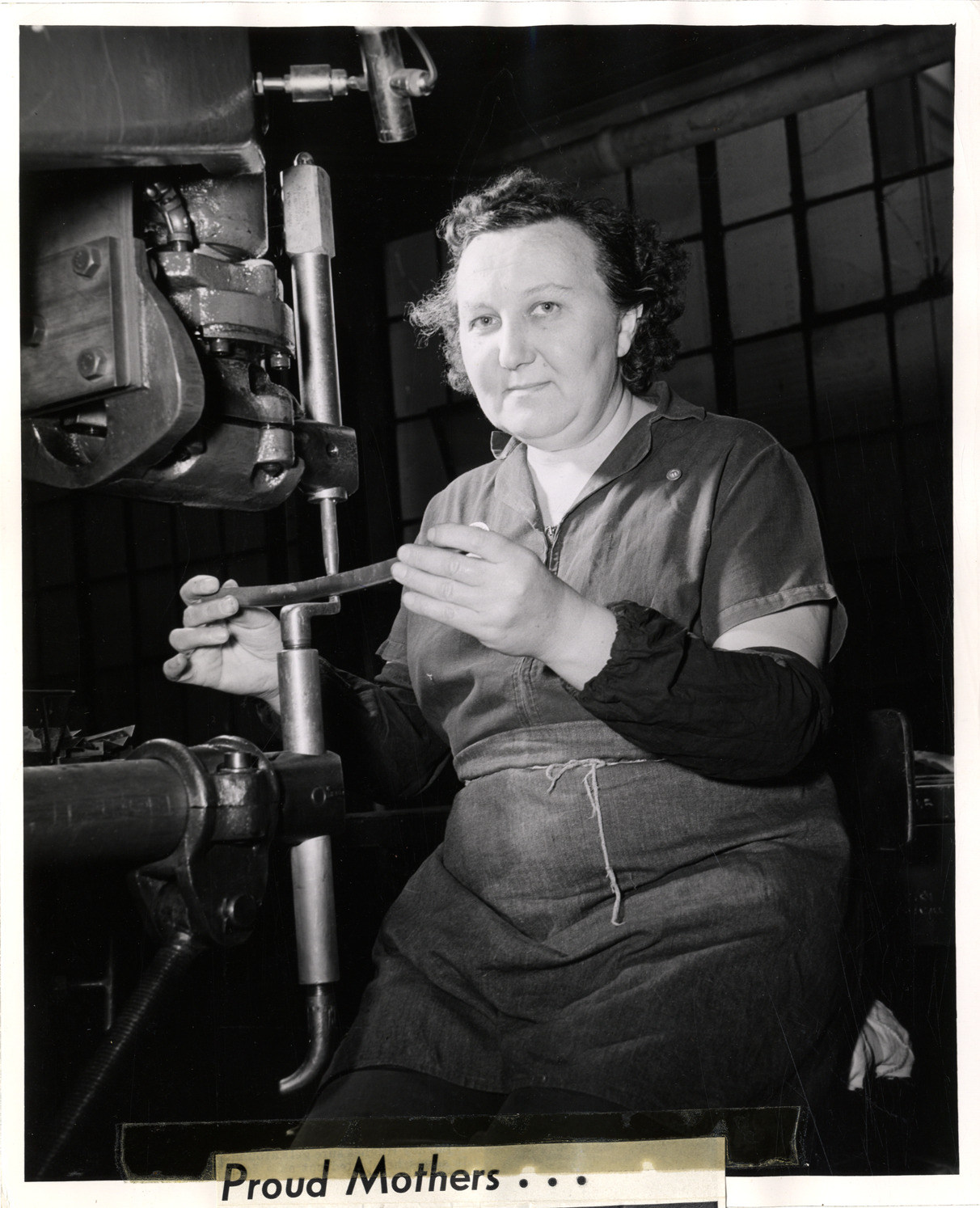 View of spot welder Anna Dudas at the Murray Corporation of America factory. Article on back: "Proud mothers. Proud are the mothers of Murraymen now serving their country in the armed service. Mrs. Anna Dudas is personally at war with the Axis. A spot welder in Department 144, Mrs. Dudas has a perfect record -- she has not had one piece scrap on the job. In addition she has helped other workers perfect their welding so that her department record has been boosted. Her son Leo, 19 years old, is now in training as a Marine. He enlisted five months ago, leaving Department 173 to join up. Mrs. Hattie E. Stone's son, William, a former Murray aircrafter whose picture appears on these pages, tried to enlist three times but was rejected. He wanted to fly but a bad ear kept him out. But he finally made it as an infantryman." Includes portraits of Leo Dudas, Anna Dudas and Hattie E. Stone. Handwritten on back: "Women workers."