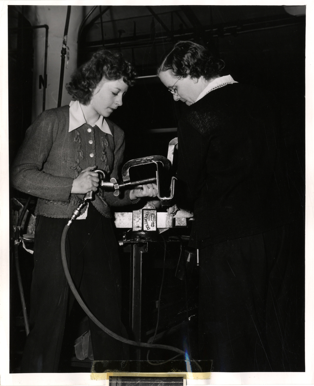 View of Ethyl Miller and her daughter, Shirley, at the Murray Corporation of America factory. Article on back: "(Left) Mother-daughter unite to form a riveter-bucker team in the Flying Fortress Nacelle Division. Wanting to do their bit in the war effort, Mrs. Ethyl Miller and her daughter Shirley enrolled in the Murray training school, and after graduation were united as a team working on the longeron of Flying Fortress nacelles." Stamped on back: "Photographic Department. Authorized print no. 825-2, date 11-1-43. Murray Corporation, Detroit." Handwritten on back: "Women workers."