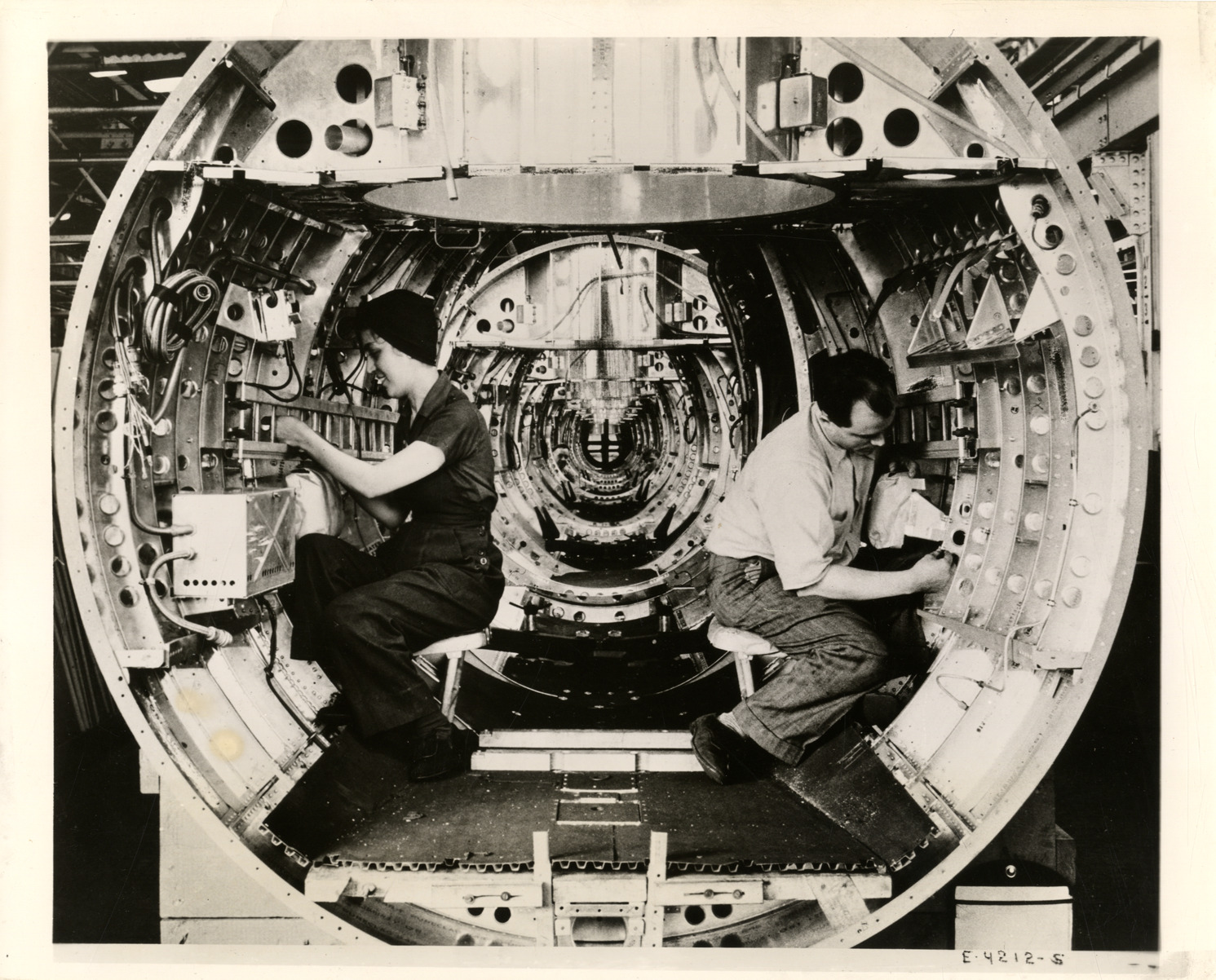 View of a man and woman assembling fuselage sections for a B-26 Marauder bombers at the Hudson Motor Company factory in Detroit. Label on back: "Hudson Motor Car Co., Detroit, Mich. Plane fuselage assembly line in an auto plant. Hitler and Tojo failed to foresee the rapidity with which American automobile plants could convert their facilities to the manufacture of planes and other war material. Two years ago this Hudson plant in Detroit was making automobiles. Today it is turning out a steady stream of fuselage sections for Martin B-26 Marauder bombers which are doing a great job in all theaters of war. The fuselage assembly line pictured is just one in the huge plant." Handwritten on back: "Women workers."