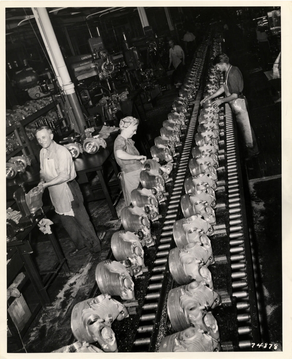 View of men and women assembling cylinder heads for Pratt & Whitney engines. Label on back: "Picture 74878. Cylinder heads, Pratt & Whitney engine. 165 different operations are performed on these cylinder heads as they pass along this assembly line. They are removed from either side for machining operations which occur along the line. The line can be stopped at given points in order to accommodate the speed of various operations. The Greenlee Company is now building several huge multiple operating machines costing nearly $1,300,000 a piece which will virtually eliminate all of the separate operations taking place along this line." Handwritten on back: "Women workers."