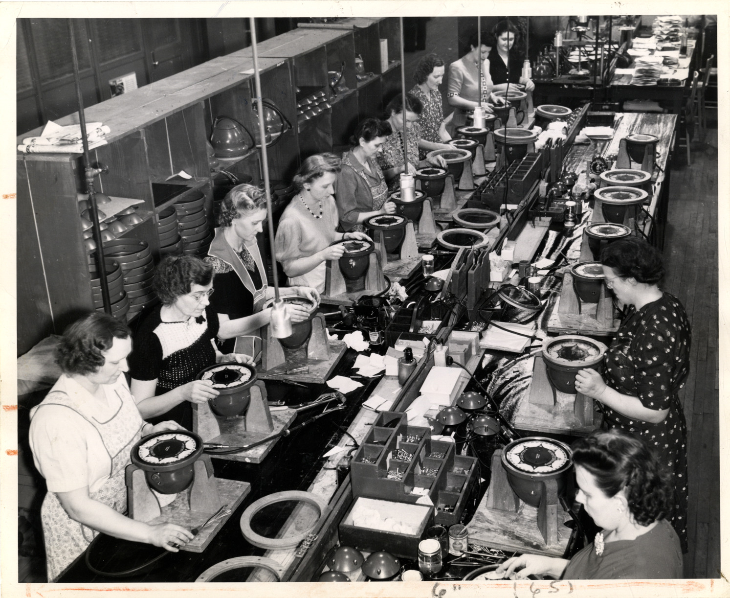View of women workers assembling the auxiliary indicator units for gyro compasses. Handwritten on back: "Assembly of auxiliary indicator units of Chrysler gro [sic] compass. 4 to each ship, located on decks & gives reading of main unit. Women workers."
