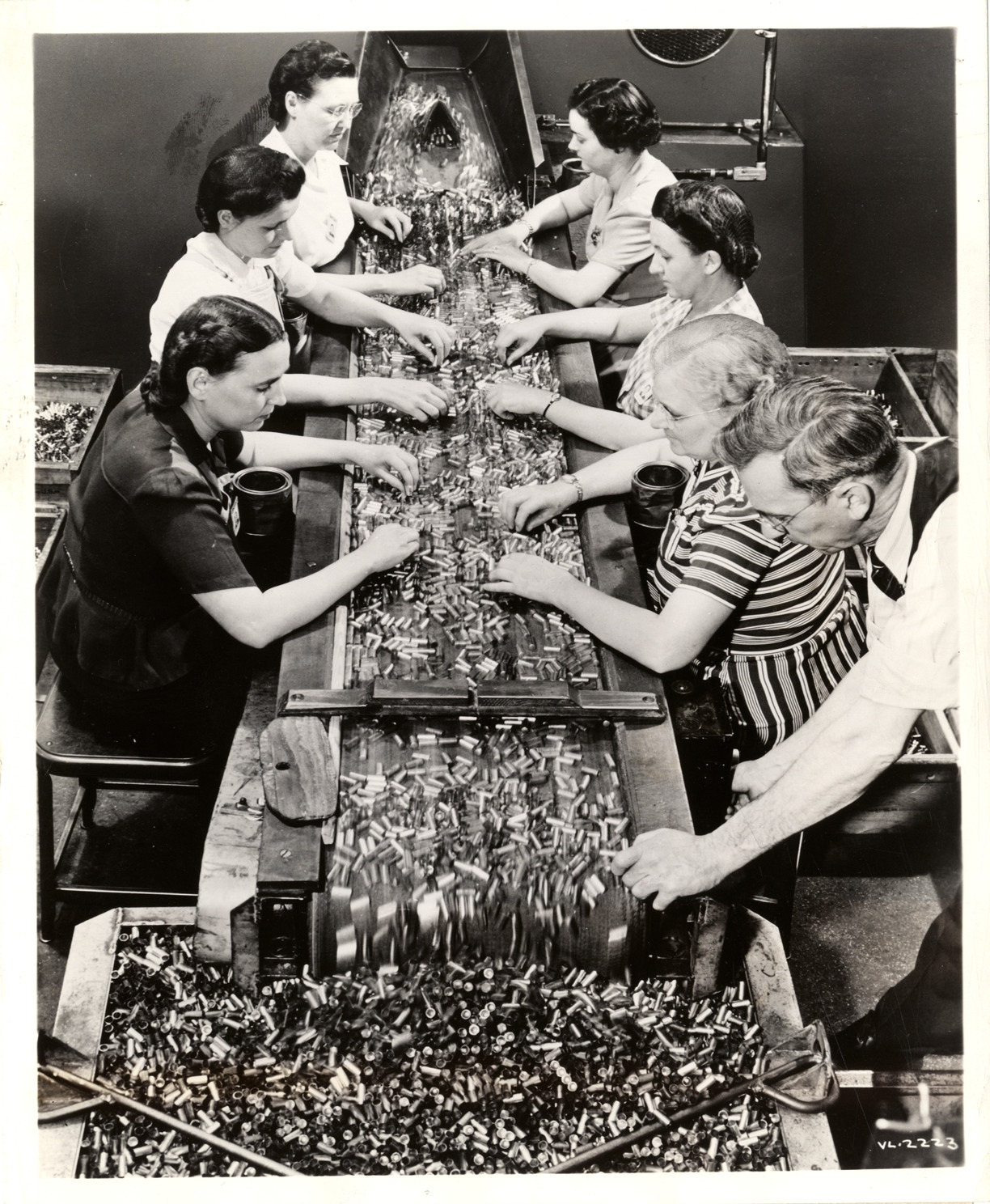 View of women workers visually inspecting steel cartridge cases at the Chrysler Evansville Ordnance plant. Label on back: "Detroit, Mich. As the steel cartridge cases in the Chrysler Corporation, Evansville Ordnance plant pass through operation after operation, they are inspected both mechanically and manually. In the above picture is shown one of the visual inspections. These inspectors become very proficient in picking out, both by sight and by feel, improperly made steel cartridge cases (VL-2223)." Handwritten on back: "Women workers."