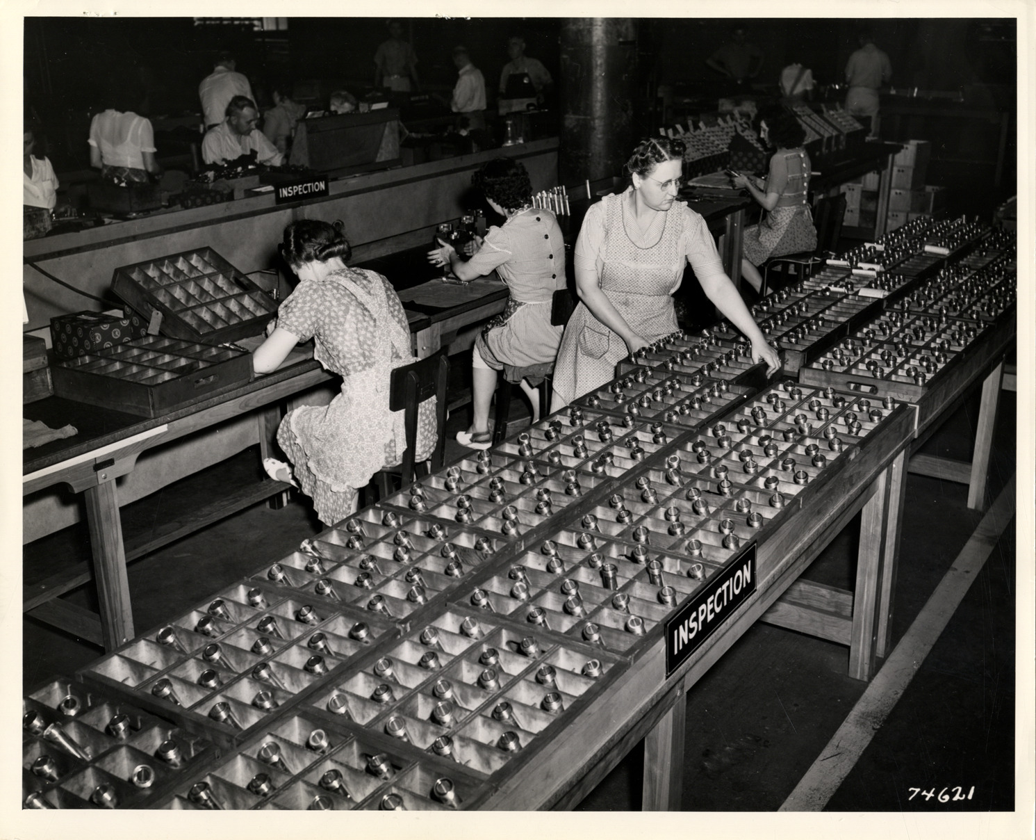 View of women workers inspecting valve tappet guides for Pratt & Whitney aircraft engines at the Nash-Kelvinator Corporation plant. Label on back: "2,000 h.p. Pratt & Whitney aircraft engine, valve tappet guide. Photograph #74621. This view shows the final inspection station so necessary to be sure all parts conform to specifications. They also show what former 'automotive' female employees can and are doing to help in the all out war effort at Nash-Kelvinator." Handwritten on back: "Women workers."