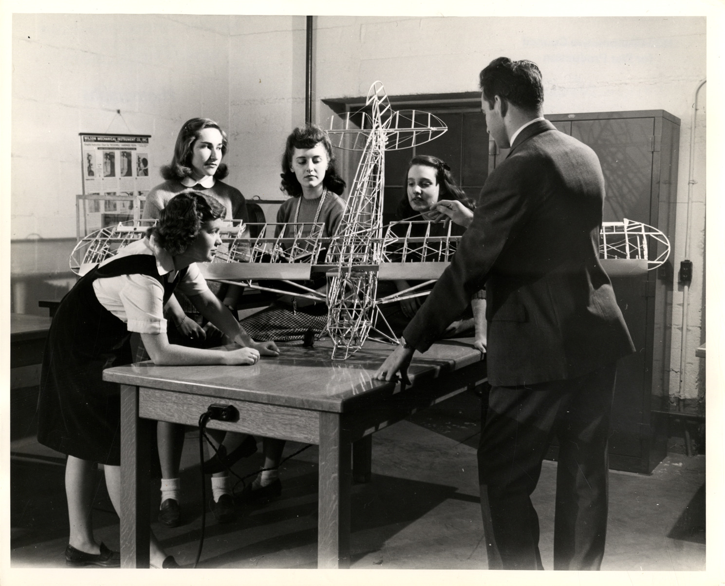 View of women engineering students and an instructor at Rutgers University examining a model of an airplane. Handwritten on back: "Engineering students, Rutgers U. Women workers."