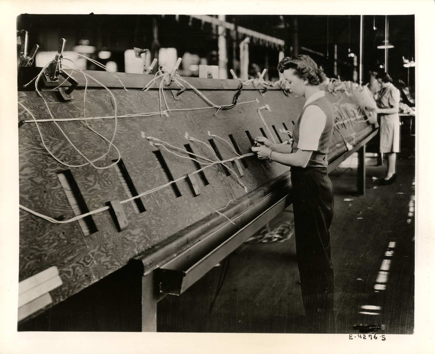 View of Peggy Gerke and Marie Dumontier assembling a B-29 Superfortress bomber wire harness at the Hudson Motor Car Company. Label on back: "Hudson Motor Car Co., Detroit, Mich. 186 wires in this B-29 harness. Peggy Gerke and Marie Dumontier start to weave the 186 wires which will go into a wire harness the Hudson Motor Car Co. makes for Boeing B-29 Superfortress. One of the wires is 900 inches long. Later fittings and plugs will be placed on the individual wires. A separate wooden board is used for each of the 146 harnesses Hudson makes for the three B-29 fuselage sections it builds." Stamped on back: "Released for immediate use by Hudson Motor Car Company, Public Relations Division, 12601 East Jefferson Avenue, Detroit 14, Michigan. Where required, release has been received from proper authority in Army or Navy Public Relations." Handwritten on back: "Women workers."