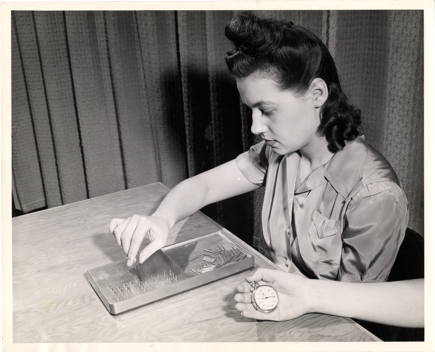 Woman worker taking test in manual dexterity, AC Spark Plug Division