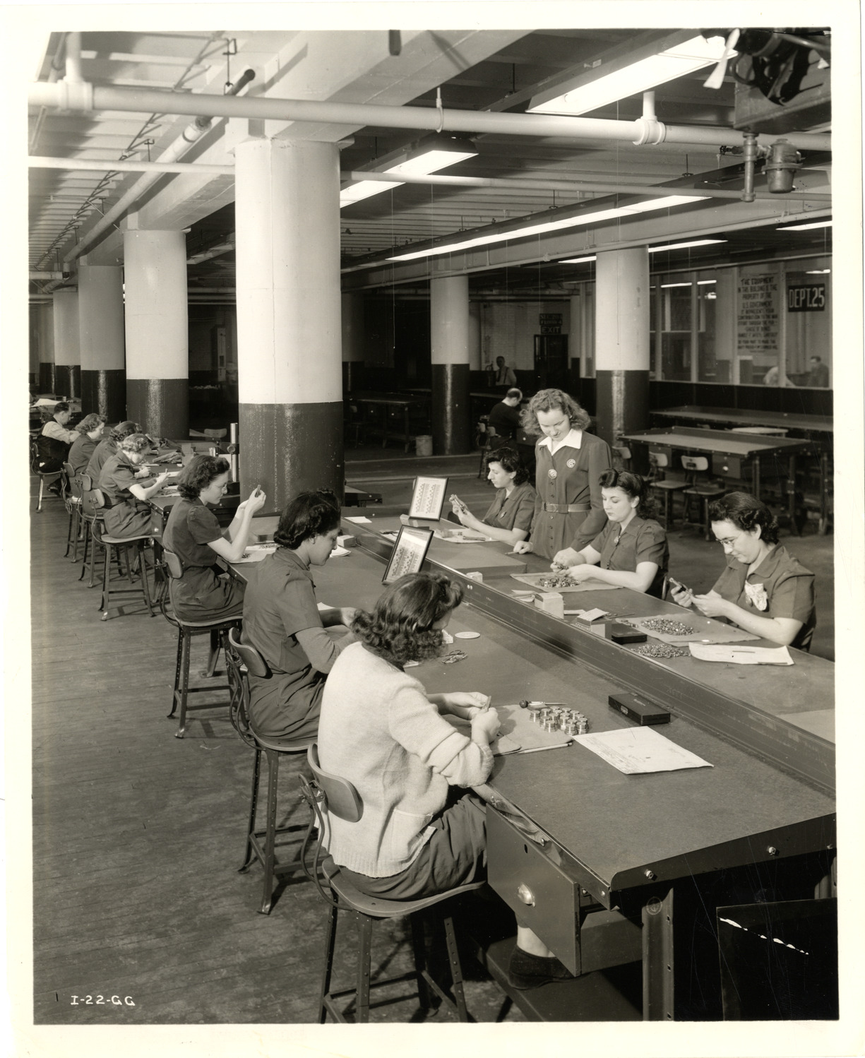 View of women workers inspecting torpedo parts at the International Harvester Company. Label on back: "Aircraft torpedo manufacture. International Harvester Company, 180 No. Michigan Ave., Chicago, Ill. I-22-GG. Women are employed by the company to inspect the many hundreds of small parts used in the torpedo. They work with small precision gauges and micrometers. All are new employes trained for this special work. Prior to becoming torpedo inspectors they were tool crib attendants, dress designers, writers, etc. Jan. 13, 1943." Handwritten on back: "Women workers."