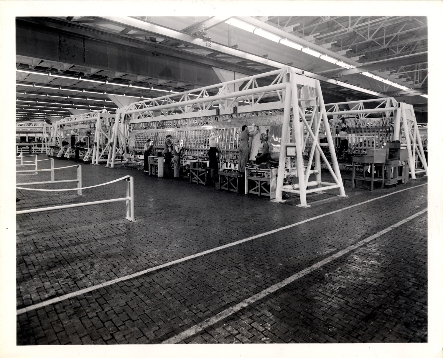 View of women workers assembling wing flaps for the B-29 Superfortress bomber at the Fisher Body Division plant in Cleveland, Ohio. Label on back: "Here women workers are assembling wing flaps for the B-29, the Army Air Forces new Superfortress at Fisher Body Cleveland Aircraft plant no. 2. Note the giant fixtures on which the wing flaps are mounted. From: W.S. McLean, Fisher Body Division, General Motors Corporation, Detroit, Michigan. Note editor: This caption and photo has been reviewed by the War Department." Stamped on back: "Fisher Body Photographic, General Motors Bldg., Detroit, Mich. Order duplicates of this print by no." Handwritten on back: "Women workers."