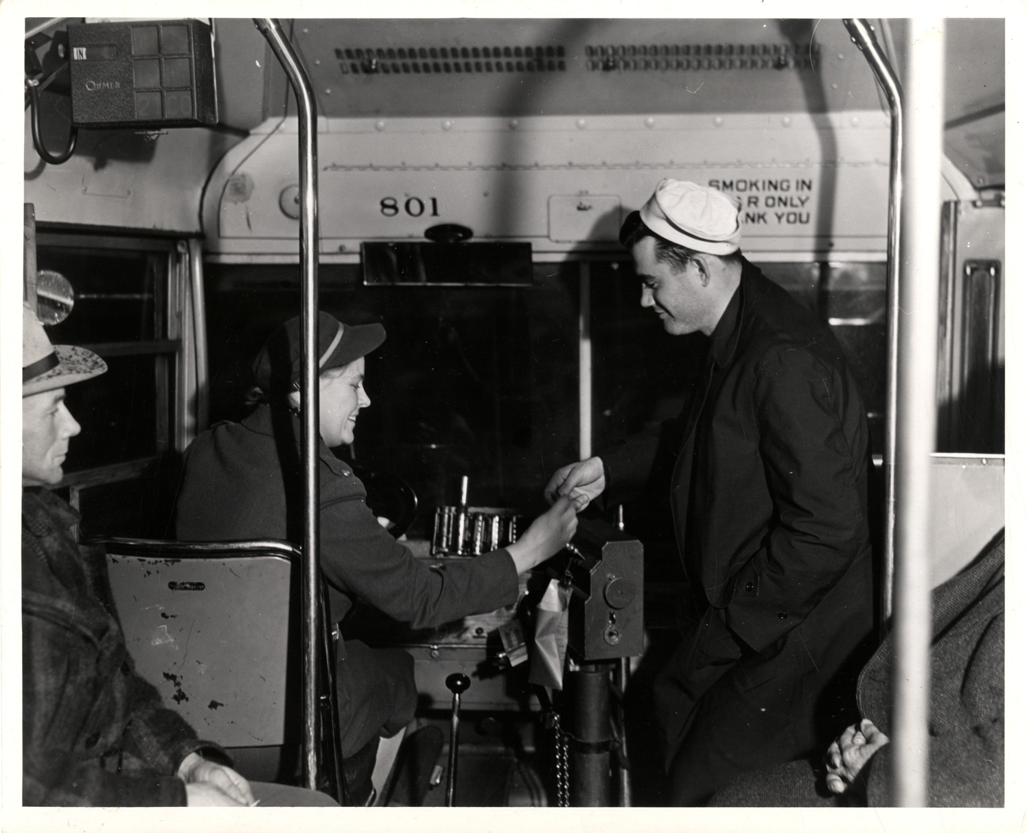 View of woman bus driver taking fare from a passenger. Printed on back: "Women in essential service. D-9784 Women bus drivers help expedite America's transportation problems. (February 1943). Please credit: Official OWI photo by Ann Rosener. Watch your credit. No objection to reproducing or publishing this picture provided credit line 'Photo by Office of War Information' appears on the photograph or page. Except that publishers must assume responsibility for all use in commercial advertising and OWI must not appear as the sponsor of any product." Handwritten on back: "Women workers."
