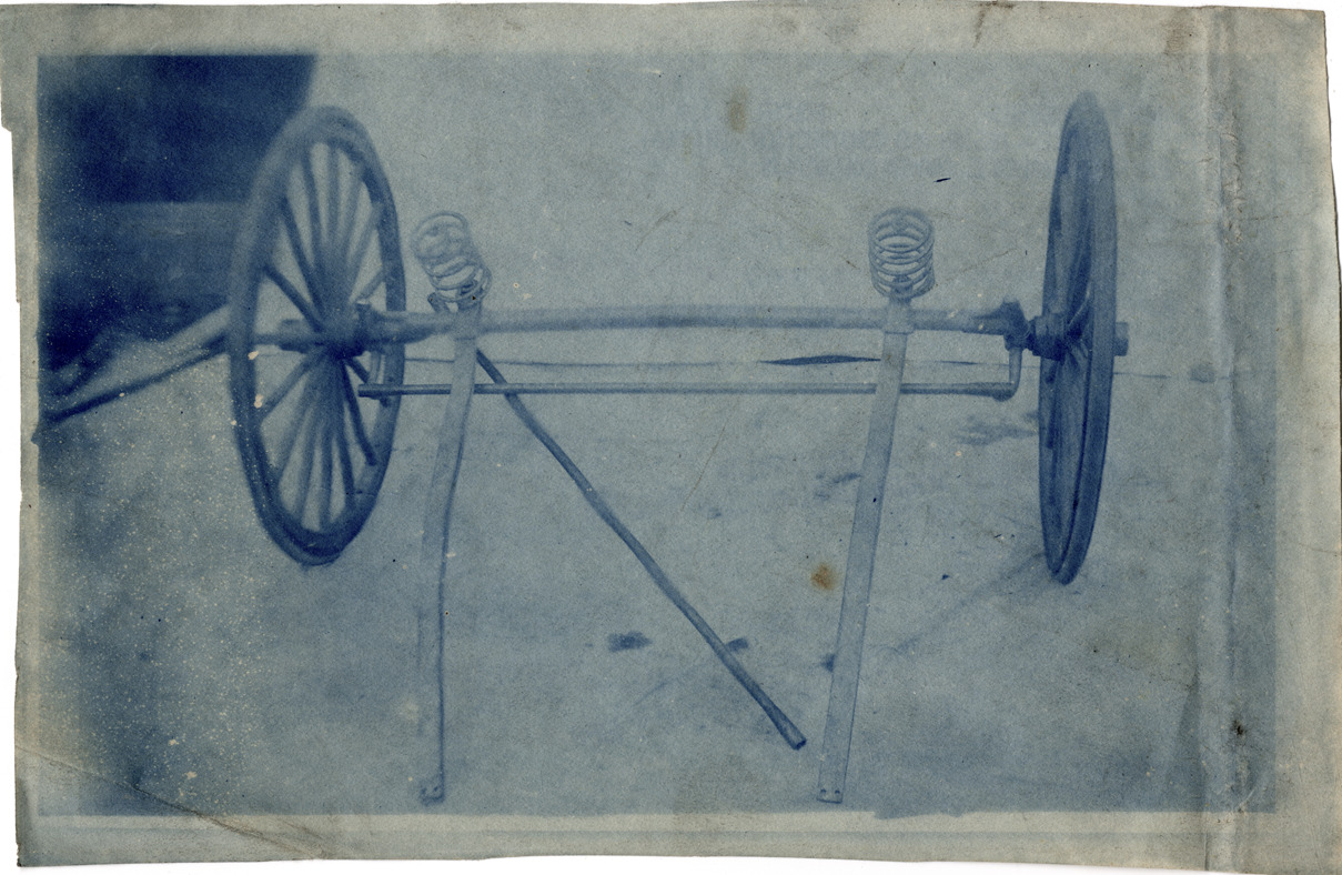 View of the front end of a Duryea automobile chassis. Typed on back: "Subject: Automobiles--Design and construction (Duryea). Collection: MS3/Charles E. Duryea Collection. Date: c. 1913. Source: Estate of Charles E. & M. Jerry Duryea. I.D.: Front frame, shows quarter elliptic springs and spiral wheels, steering heads, and tie bar."