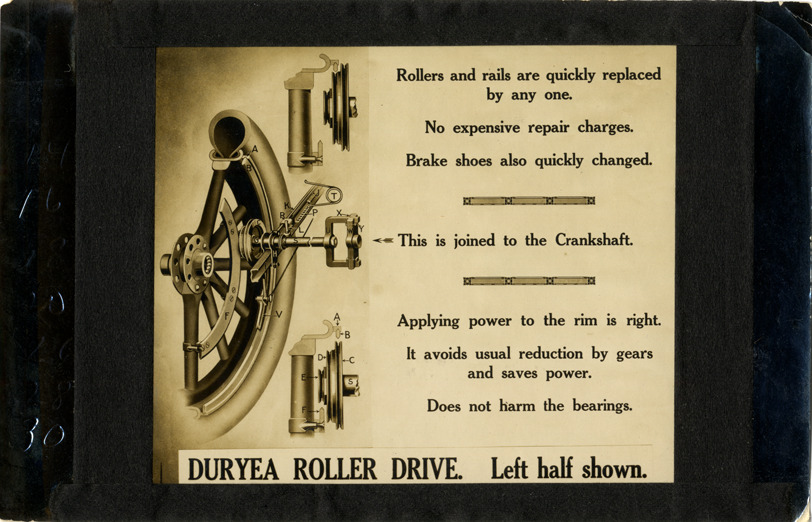 View of a Duryea automobile roller drive. Printed on front: "Rollers and rails are quickly replaced by any one. No expensive repair charges. Brake shoes are also quickly changed. This is joined to crankshaft. Applying power to the rim is right. It avoids usual reduction by gears and saves power. Does not harm the bearings. Duryea roller drive. Left half shown." Typed on back: "Subject: Automobiles--Design and construction (Duryea). Collection: MS3/Charles E. Duryea Collection. Date: c. 1917-1921. Source: Estate of Charles E. & M. Jerry Duryea. I.D.: Duryea roller drive."