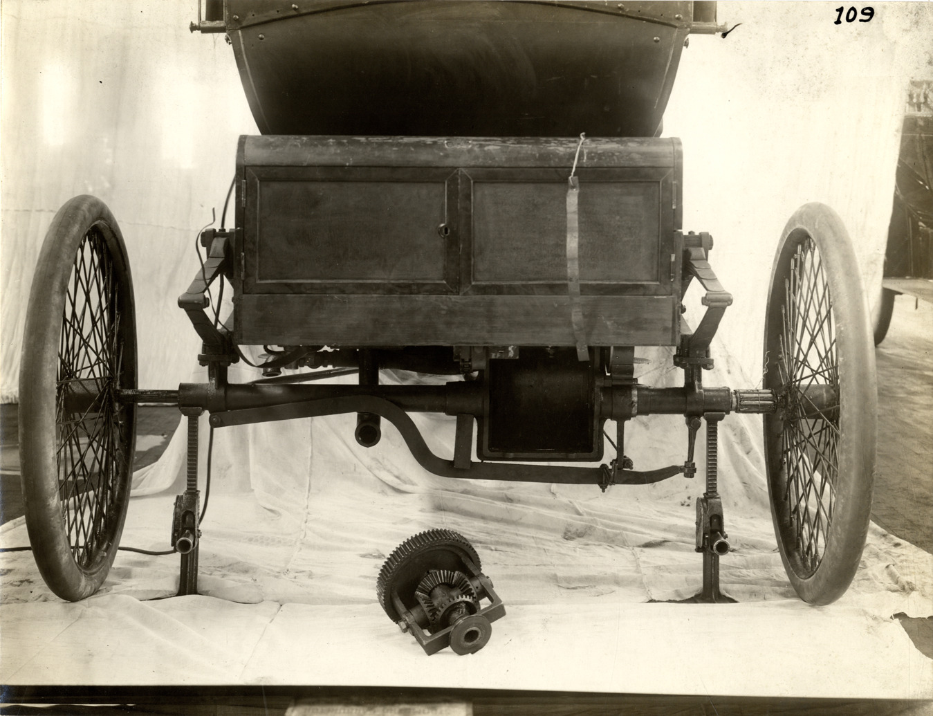 Rear view of an unidentified car. Handwritten on back: "Subject: Automobiles--Design and construction (Duryea). Collection: MS3/Charles E. Duryea Collection. Date: c. 1895-1905. Source: Estate of Charles E. & M. Jerry Duryea. I.D.: Unknown. (Duryea was expert on patents, and was hired as an expert witness for various trials such as the famous 'Selden patent' case. These photos appear to be exhibits from one of those legal suits.)"