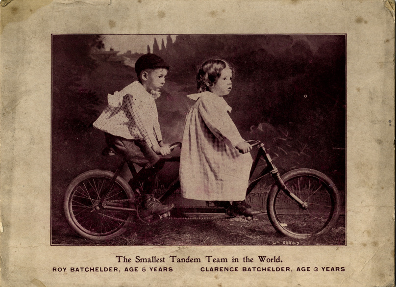 View of Roy and Clarence Batchelder, riding a tandem bicycle. Printed on front: "The smallest tandem team in the world. Roy Batchelder, age 5 years. Clarence Batchelder, age 3 years." Handwritten on back: "Subject: Bicycles. Collection: MS3/Charles E. Duryea Collection. Source: Estate of Charles E. & M. Jerry Duryea. I.D.: The smallest tandem team in the world. Roy Batchelder, age 5. Clarence Batchelder, age 3."