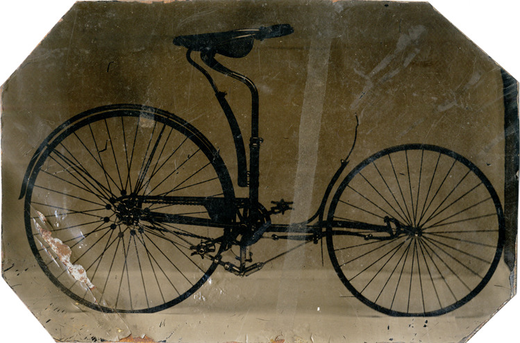 View of a bicycle which incorporates an invention by Charles Duryea. Label on back: "Subject: Bicycles. Collection: MS3/Charles E. Duryea Collection. Date: 1880's. Source: Estate of Charles E. & M. Jerry Duryea. I.D.: Bicycle incorporating invention, by Charles Duryea, Chicopee/Springfield, Mass."