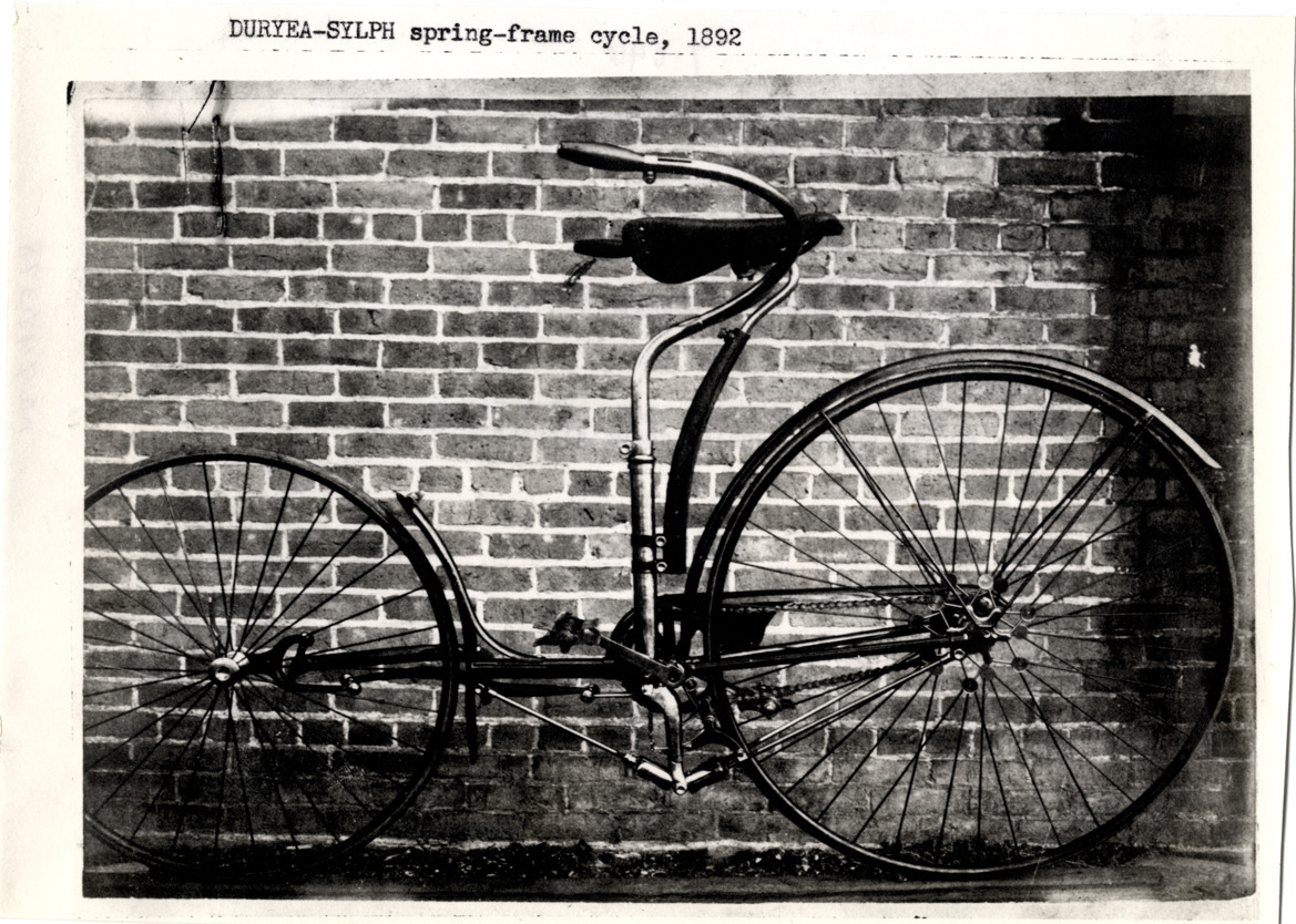 View of a Duryea-Sylph bicycle. Printed on front: "Duryea-Sylph spring-frame cycle, 1892." Typed on back: "Subject: Bicycles. Collection: MS3/Charles E. Duryea Collection. Date: 1890-92. Source: Estate of Charles E. & M. Jerry Duryea. I.D.: Duryea Sylph. Spring frame bicycle."