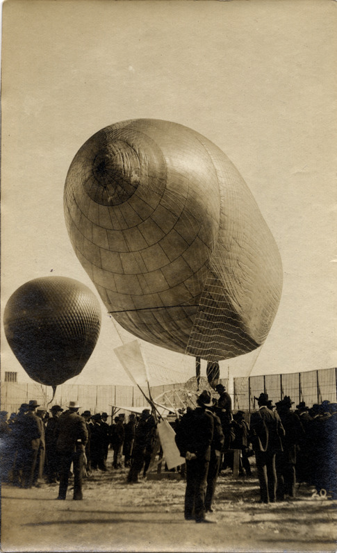 View of a crowd viewing a hot air balloon and blimp. Typed on back: "Subject: Dirigibles. Collection: MS3/Charles E. Duryea Collection. Source: Estate of Charles E. & M. Jerry Duryea." Stamped on back: "T.S. Baldwin, care J.C. Irvine & Co., 751 Market St., S.F."