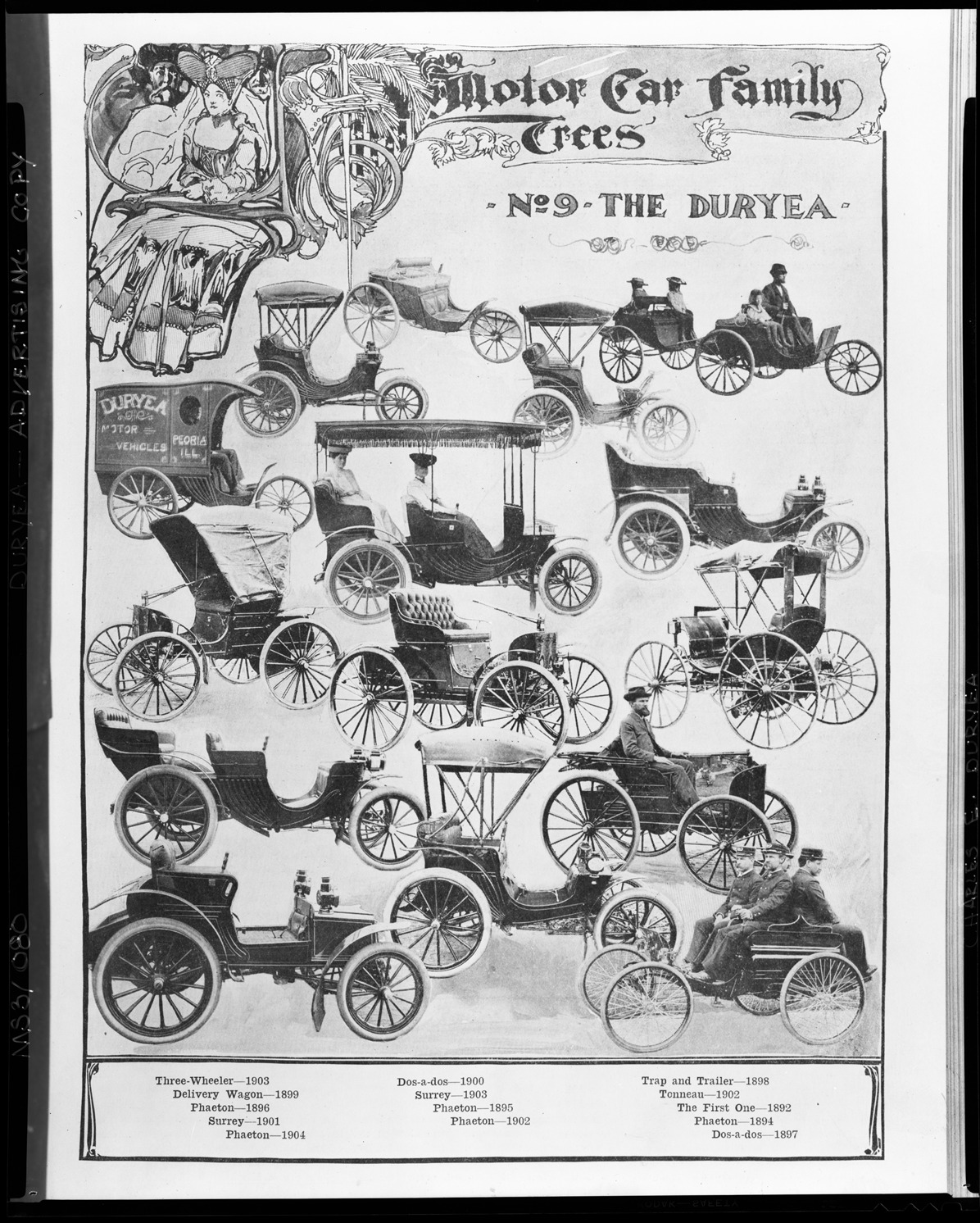 View of Duryea automobile advertisement from Motor Age magazine, May 19, 1904 issue, depicting various models. Printed on front: "Motor car family trees, no. 9, the Duryea. Three-wheeler, 1903. Delivery wagon, 1899. Phaeton, 1896. Surrey, 1901. Phaeton, 1904. Dos-a-dos, 1900. Surrey, 1903. Phaeton, 1895. Phaeton, 1902. Trap and trailer, 1898. Tonneau, 1902. The first one, 1892. Phaeton, 1894. Dos-a-dos, 1897." Typed on sleeve: "Subject: Duryea advertising copy. Collection: MS3/Charles E. Duryea Collection. Date: 19 May 1904. Source: Estate of Charles E. & M. Jerry Duryea. I.D.: Motor Age magazine, publication 19 May 1904 issue, p. 11."