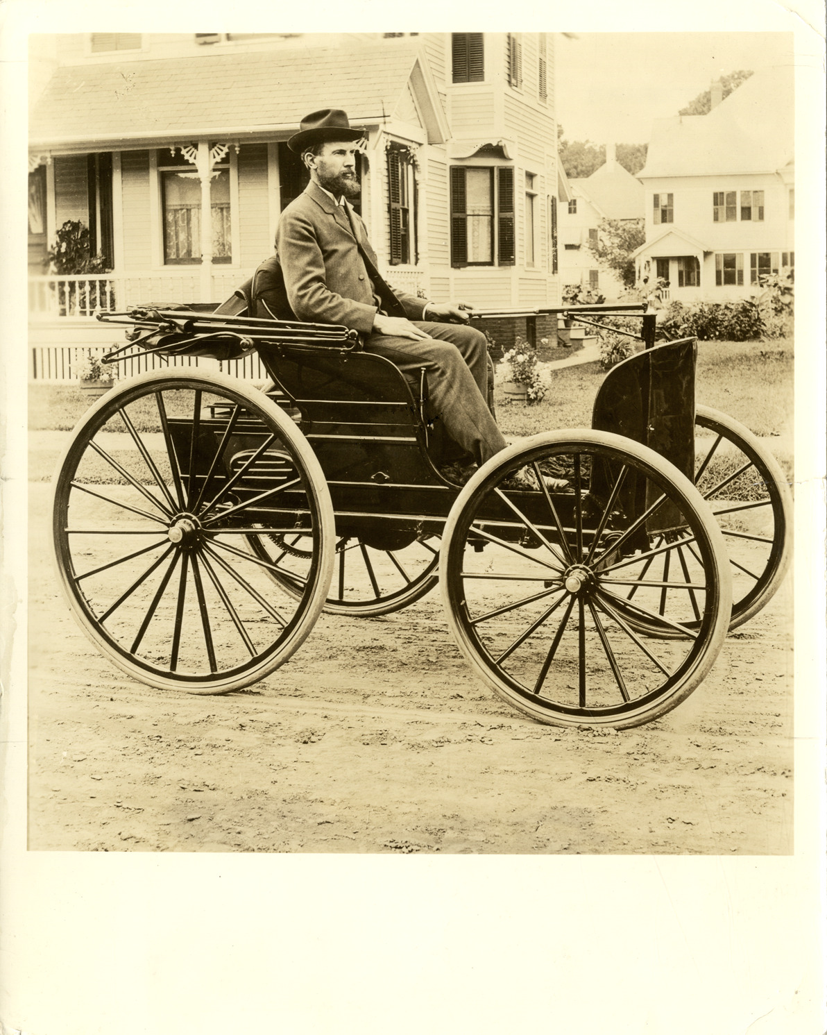View of Charles E. Duryea posing in an 1895 Duryea phaeton automobile, in front of the residence of J. Frank Duryea in Springfield, Massachusetts. Typed on back: "Charles E. Duryea in the Duryea motor wagon which was driven by J. Frank Duryea to win America's first automobile race, Chicago, 1895. Race was held on Thanksgiving Day, November 28, 1895." Subject: Duryea automobiles. Collection: MS3/Charles E. Duryea Collection. Date: c.1894-1895. Source: Estate of Charles E. & M. Jerry Duryea. I.D.: Duryea phaeton. Citation on back of photo: Charles E. Duryea in the Duryea motor wagon which was driven by Frank Duryea (his brother) to win America's first automobile race, Chicago, 1895. Race was held on Thanksgiving Day, 28 November 1895."