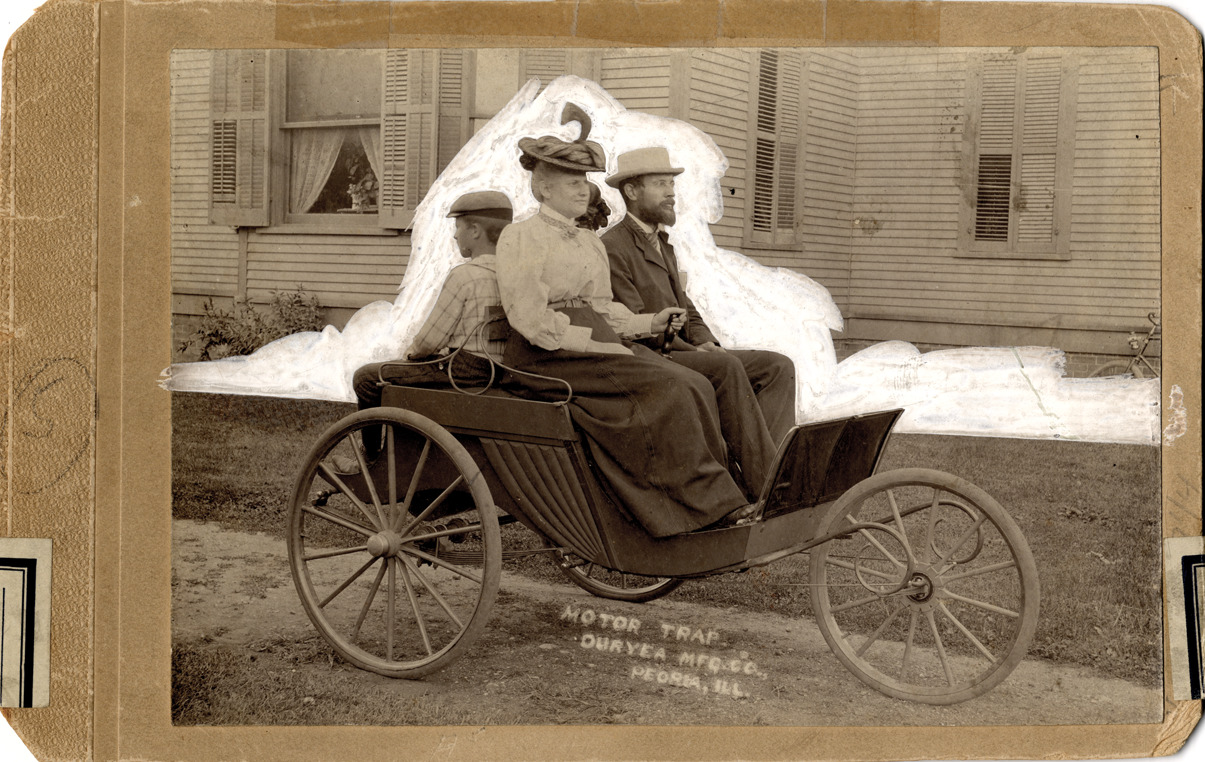 View of Charles E. Duryea and family in an 1898 Duryea dos-a-dos trap. Printed on front: "Motor trap. Duryea Mfg. co., Peoria, Ill." Label on back: "Subject: Duryea automobiles. Collection: MS3/Charles E. Duryea Collection. Date: 1898. Source: Estate of Charles E. & M. Jerry Duryea. I.D.: Duryea dos-a-dos trap. Charles E. Duryea (and family)." Handwritten on back: "This is the first of the 1898 model Duryea cars. Begun in 1897 and first run in June 1898. It was the first regularly made car to have 3 cylinders & planetary transmission. The first regularly made to have 3 wheels and modern carburetor. All Duryea cars had central control and could be driven from either side. This model had the vertical tiller. Side way movement steered. Up gave high speed, down gave low. Heel pedal reversed, toe pedal applied brake. A twist throttle."
