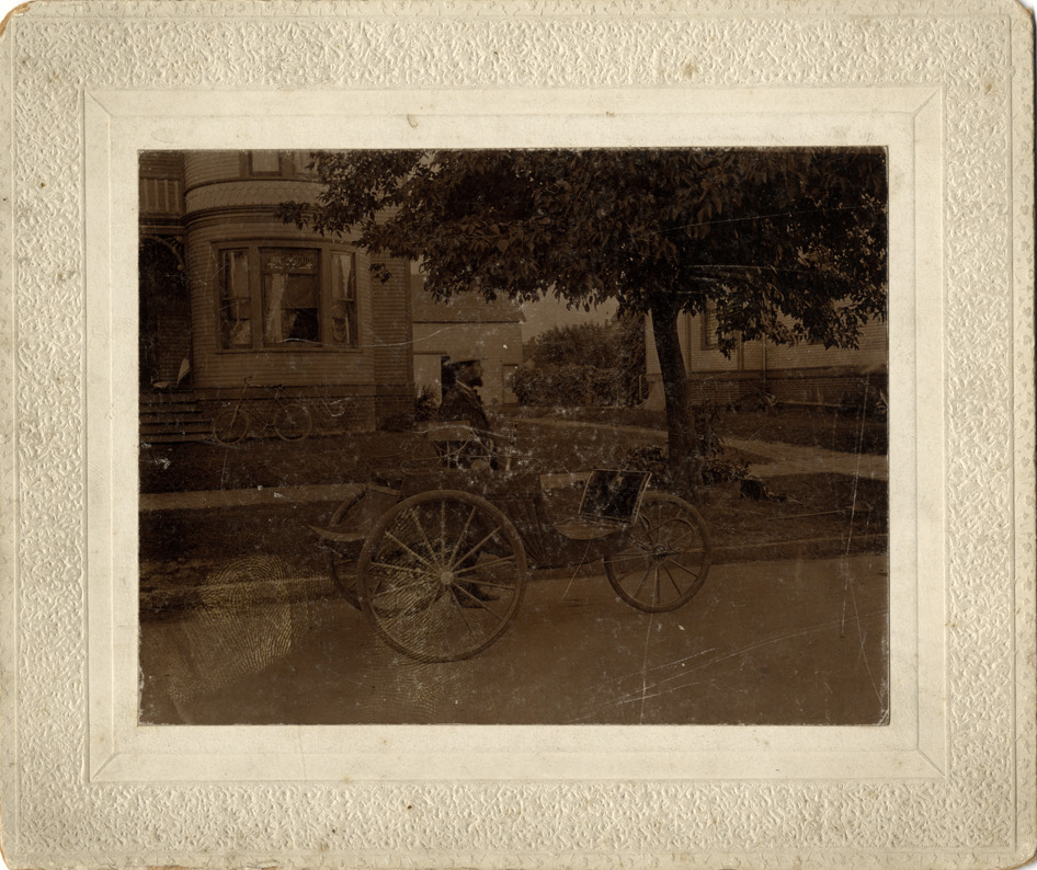 View of Charles E. Duryea driving an 1898 Duryea dos-a-dos trap in front of his residence in Peoria, Illinois. Handwritten on back: "Subject: Duryea automobiles. Collection: MS3/Charles E. Duryea Collection. Date: c. 1898. Source: Estate of Charles E. & M. Jerry Duryea. I.D.: Duryea dos-a-dos trap, photo taken Peoria, Ill. Home (208 Barker Ave.) of Charles E. Duryea in background."