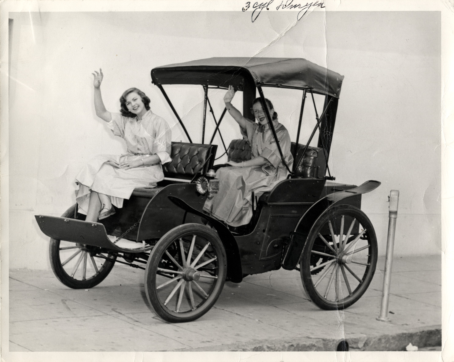 Two women posing in a 1902 Duryea folding front phaeton