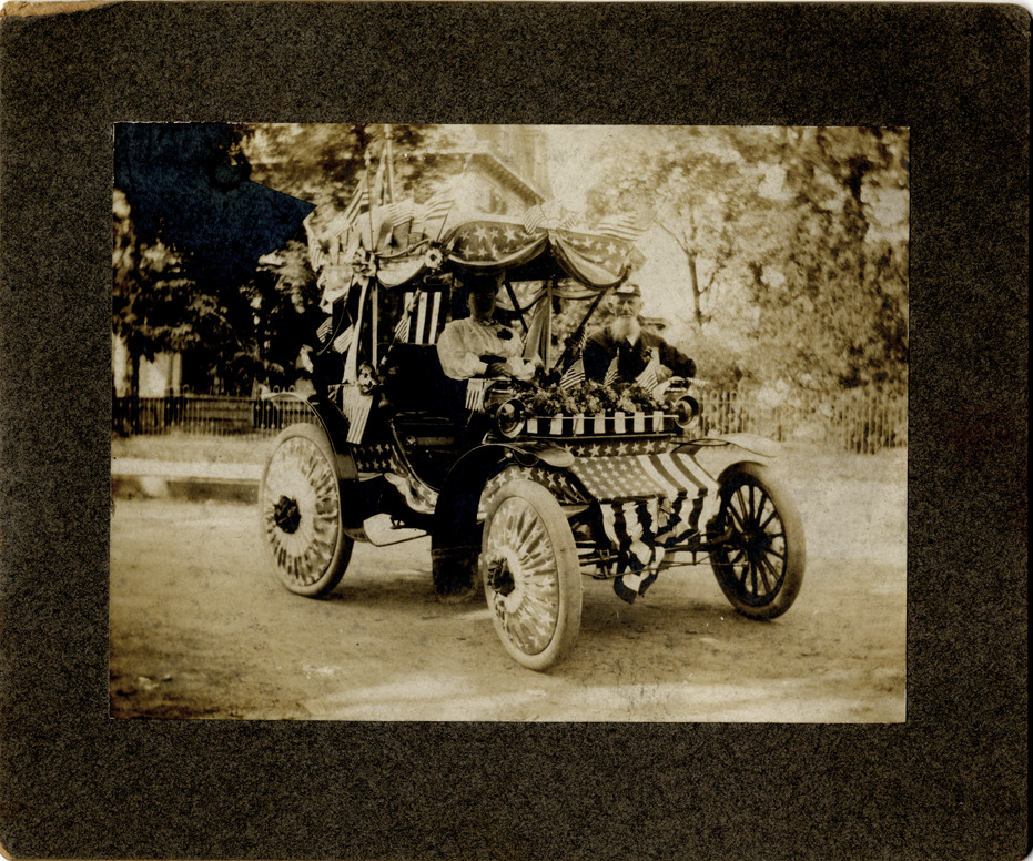 View of a man and woman posing with a 1903 Duryea four-wheeled phaeton, which has been decorated with American flag and bunting. Handwritten on back: "Subject: Duryea automobile. Collection: MS3/Charles E. Duryea Collection. Date: 1903. Source: Estate of Charles E. & M. Jerry Duryea. I.D.: Duryea four-wheeled phaeton. For Charles E. Duryea."