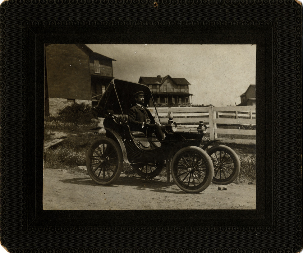 View of Charles E. Duryea posing in a 1903 Duryea four-wheeled phaeton. Handwritten on back: "Subject: Duryea automobile. Collection: MS3/Charles E. Duryea Collection. Date: 1903. Source: Estate of Charles E. & M. Jerry Duryea. I.D.: Duryea four-wheeled phaeton. (Charles Duryea at wheel)."