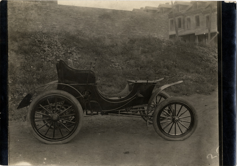View of a 1905 Duryea four-wheeled phaeton. Typed on back: "Subject: Duryea automobile. Collection: MS3/Charles E. Duryea Collection. Date: 1905. Source: Estate of Charles E. & M. Jerry Duryea. I.D.: Duryea four-wheeled phaeton." Stamped on back: "Duryea automobiles, Reading, Pa."