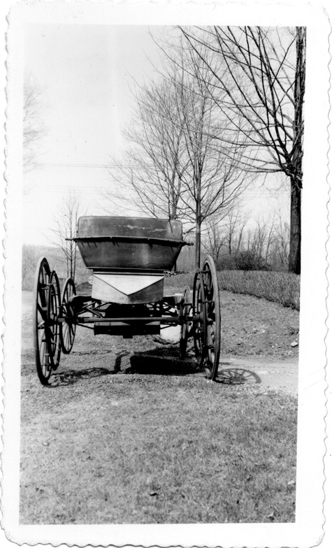 View of a 1908-1910 Duryea buggyaut. Typed on back: "Subject: Duryea automobile. Collection: MS3/Charles E. Duryea Collection. Date: 1908-1910. Source: Estate of Charles E. & M. Jerry Duryea. I.D.: 6 June 1945; Duryea buggyaut." Stamped on back: "M.J. Duryea, 17 Farmington Avenue, Longmeadow, Mass." Handwritten on back: "Duryea, Saginaw, Mich., 6/6/45."