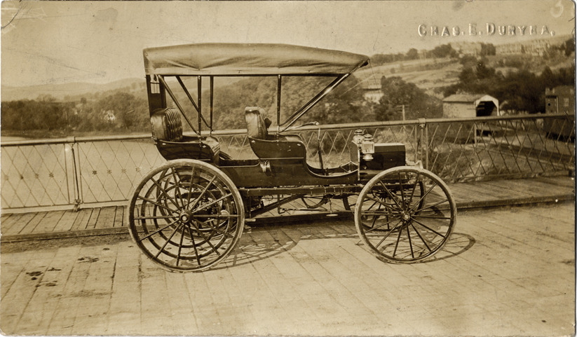 View of a 1911 Duryea four passenger surrey. Embossed on front: "Chas. E. Duryea, Reading, Pa." Typed on back: "Subject: Duryea automobile. Collection: MS3/Charles E. Duryea Collection. Date: 1911. Source: Estate of Charles E. & M. Jerry Duryea. I.D.: Duryea four passenger surrey. Same chasis [sic] as buggyaut."