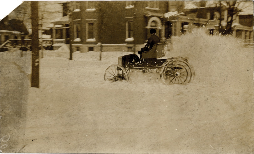 View of a man driving a 1912 Duryea buggyaut runabout during winter. Typed on sleeve: "Subject: Duryea automobile. Collection: MS3/Charles E. Duryea Collection. Date: 1912. Source: Estate of Charles E. & M. Jerry Duryea. I.D.: Duryea buggyaut, runabout (2 passenger), winter scene."