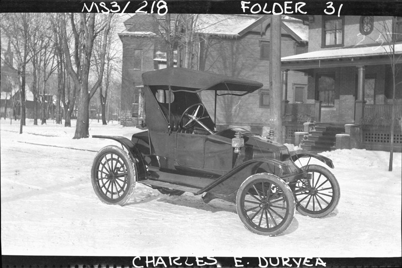 View of a 1914 Duryea pneumatic tire runabout. Handwritten on negative: "Charles E. Duryea." Typed on sleeve: "Subject: Duryea automobile. Collection: MS3/Charles E. Duryea Collection. Date: 1914 model year (1913 photograph). Source: Estate of Charles E. & M. Jerry Duryea. I.D.: Pneumatic tire runabout (notice steering wheel also)."