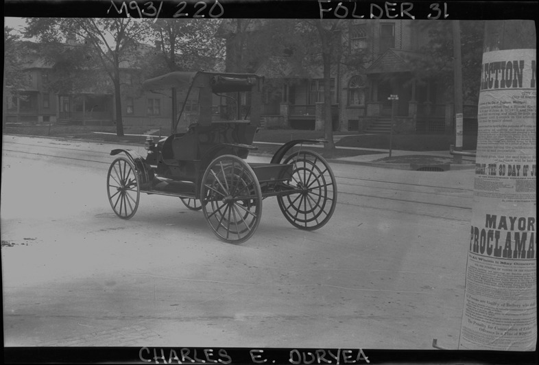 View of a 1914 Duryea buggyaut surrey. Handwritten on negative: "Charles E. Duryea." Typed on sleeve: "Subject: Duryea automobile. Collection: MS3/Charles E. Duryea Collection. Date: 1914 model year. Source: Estate of Charles E. & M. Jerry Duryea. I.D.: Duryea buggyaut, surrey (2 passenger, rear seat removed). Notice broadside: special election, Saginaw dated June 30, 1913)."