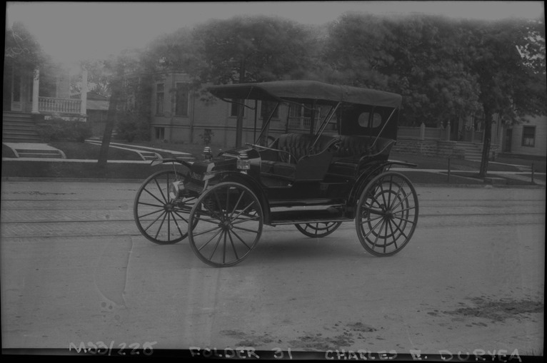 View of a 1914 Duryea buggyaut surrey. Handwritten on negative: "Charles E. Duryea." Typed on sleeve: "Subject: Duryea automobile. Collection: MS3/Charles E. Duryea Collection. Date: 1914 model year. Source: Estate of Charles E. & M. Jerry Duryea. I.D.: Duryea buggyaut, surrey (4 passenger)."