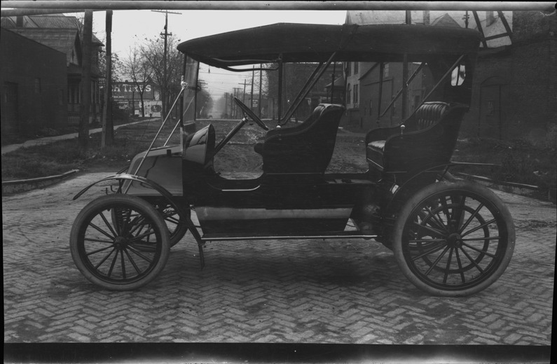 View of a 1914 Duryea pneumatic tire four passenger surrey. Typed on sleeve: "Subject: Duryea automobile. Collection: MS3/Charles E. Duryea Collection. Date: 1914 model year. Source: Estate of Charles E. & M. Jerry Duryea. I.D.: Pneumatic tire 4 passenger surrey (photo published in The Automobile Magazine, vol. 30, pt. 1. Jan 15, 1914, p. 178). Notice steering wheel also."