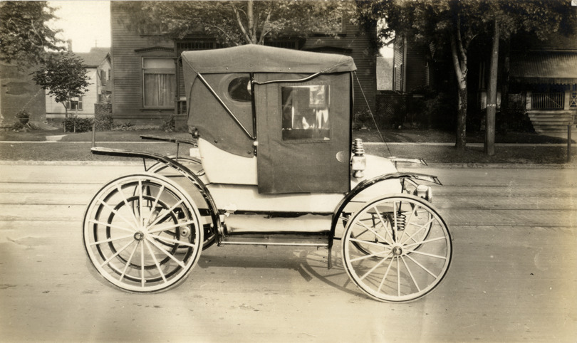 View of a 1914 Duryea buggyaut, winter model. Typed on back: "Subject: Duryea automobile. Collection: MS3/Charles E. Duryea Collection. Date: 1914 model year. Source: Estate of Charles E. & M. Jerry Duryea. I.D.: Duryea buggyaut, winter model." Stamped on back: "Duryea Motor Co., Saginaw, Mich."