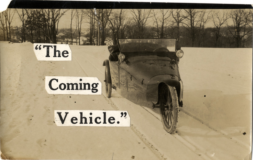 View of a 1917-1921 Duryea Gem roadster. Label on front: "The coming vehicle." Typed on back: "Subject: Duryea automobile. Collection: MS3/Charles E. Duryea Collection. Date: 1917-1921. Source: Estate of Charles E. & M. Jerry Duryea. I.D.: Duryea Gem roadster."