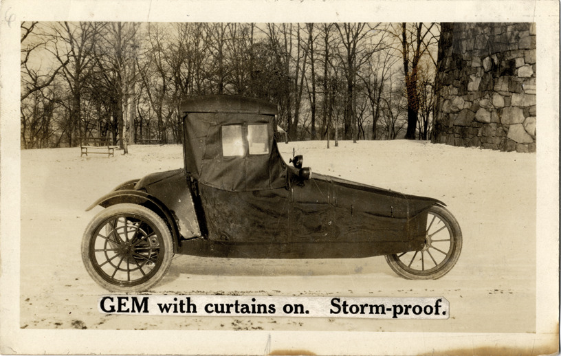 View of a 1917-1921 Duryea Gem roadster. Label on front: "Gem with curtains on. Storm-proof." Typed on back: "Subject: Duryea automobile. Collection: MS3/Charles E. Duryea Collection. Date: 1917-1921. Source: Estate of Charles E. & M. Jerry Duryea. I.D.: Duryea Gem roadster."
