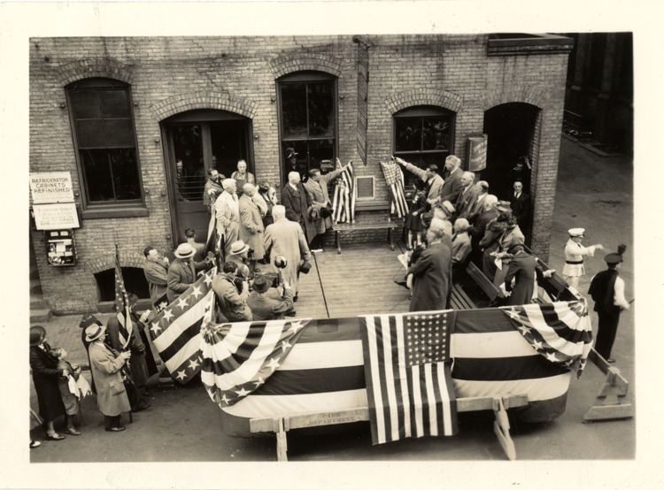 View of ceremony for the unveiling of a tablet honoring Charles E. Duryea in Springfield, Massachusetts. Dignitaries are gathered on dais; platform is decorated with bunting and an American flag. Typed on back: "Subject: Duryea awards, plaques. Collection: MS3/Charles E. Duryea Collection. Date: 1937. Source: Estate of Charles E. & M. Jerry Duryea. I.D.: Unveiling of tablet at 47 Taylor St., Springfield, Mass. honoring Charles E. Duryea as 'Father of the automobile.'" Handwritten on back: "47 Taylor St., Springfield, Mass."