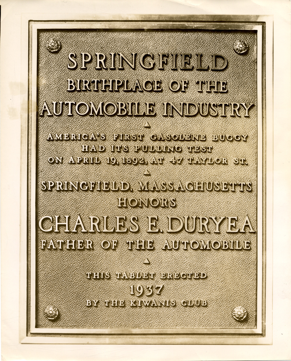 View of a tablet honoring Charles E. Duryea in Springfield, Massachusetts. Tablet reads: "Springfield, birthplace of the automobile industry. America's first gasoline buggy had its pulling test on April 19, 1892, at 47 Taylor St. Springfield, Massachusetts honors Charles E. Duryea, father of the automobile. This tablet erected 1937 by the Kiwanis Club." Typed on back: "Subject: Duryea awards, plaques. Collection: MS3/Charles E. Duryea Collection. Date: 1937. Source: Estate of Charles E. & M. Jerry Duryea. I.D.: Tablet honoring Charles E. Duryea as the 'Father of the automobile,' Springfield, Mass."