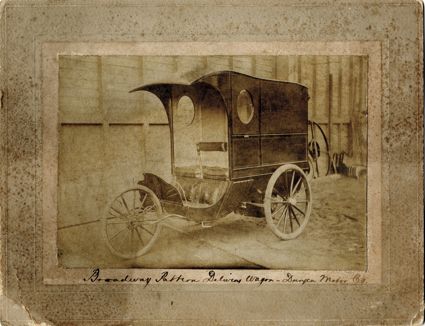 View of an1899 Duryea light delivery wagon. Handwritten on front: "Broadway Pattern delivery wagon, Duryea Motor Co." Handwritten on back: "Subject: Duryea motor truck. Collection: MS3/Charles E. Duryea Collection. Date: 1899. Source: Estate of Charles E. & M. Jerry Duryea. I.D.: Duryea light delivery wagon."